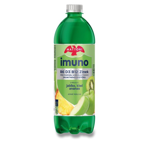 Ochucená minerální voda Mattoni Imuno s vyváženým poměrem minerálů a stopových prvků s příchutí jablka ananasu a kiwi. Objem 700 ml. Spojení minerální vody Mattoni a přírodních aromat. Skvělá a osvěžující chuť ovoce plná bublinek. Výživové hodnoty na 100 g: energetická hodnota 71 kJ / 17 kcal, sacharidy 4 g, z toho cukry 4 g, sůl 0,02 g. Vitamíny ve 100 ml: vitamín A 60 μg 7,5% RI, Vitamín B6 0,11mg 7,5% RI, Vitamín D3 0,375 μg 7,5% RI, Zinek 0,75 mg 7,5% RI, třapatka nachová, řemdihák, kozinec, přeslička, ženšen, ginkgo biloba, šípek. RI = Referenční hodnota příjmu vitamínů a minerálních látek.